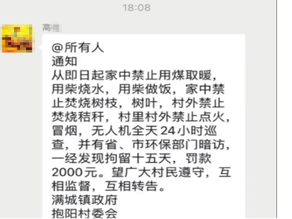 12月5日,一张聊天群内的截图在网上引发关注。截图显示,河北保定满城县满城镇政府与抱阳村村委会在群中联合通知村民,禁止在家中烧柴做饭等,一经发现拘留十五天,罚款2000元。