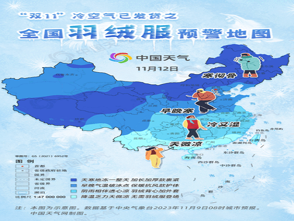 双十一冷空气已发货!全国羽绒服预警地图出炉 三分之二国土需羽绒服护体