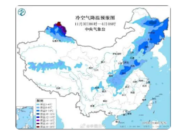中国天气网讯 今天(11月3日),随着冷空气东移南下,华北、东北多地将遭遇大暖之后的气温骤降。明天,新一股冷空气将无缝衔接影响我国,届时我国大部都将出现明显降温,局地累计降幅超10℃,秋裤、棉服等保暖装备需要登场了。