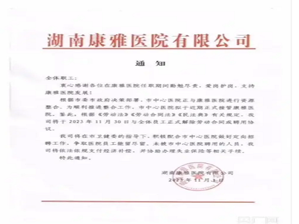 央广网益阳11月2日消息(记者张志诚 见习记者黄珂岚)11月1日晚,湖南益阳康雅医院发布一则通知,鉴于益阳市中心医院近期将正式接管康雅医院,决定于11月30日和全体员工正式解除劳动或聘用协议。