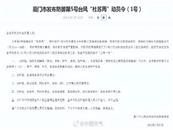 厦门市刚刚面向全体市民及外地在厦人员发出防御第5号台风“杜苏芮”动员令(1号),称今年第5号超强台风“杜苏芮”,预计将于7月28日早晨到上午在晋江至漳浦沿海登陆,登陆时为强台风或超强台风(风力14~16级),同时带来特大暴雨,将对厦门市造成严重影响。