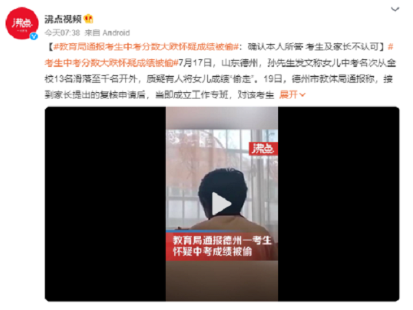 7月17日,山东德州,孙先生发文称女儿中考名次从全校13名滑落至千名开外,质疑有人将女儿成绩“偷走”。