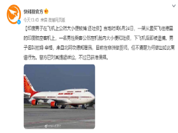 当地时间6月24日,一架从孟买飞往德里的印度航空客机上,一名男性乘客公然在机舱内大小便和吐痰,下飞机后即被逮捕。男子名叫拉姆·辛格,来自北阿坎德邦居民,目前在非洲做厨师,但不清楚为何做出如此离谱行为。