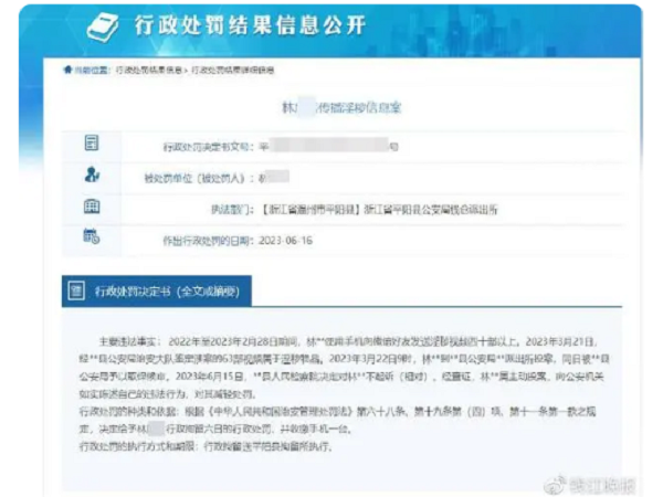 近日在浙江政务服务网上,出现了一个罕见的行政处罚案例。平阳的一名男子林某某,因为“传播淫秽信息”而被派出所给予行政拘留六日的行政处罚。