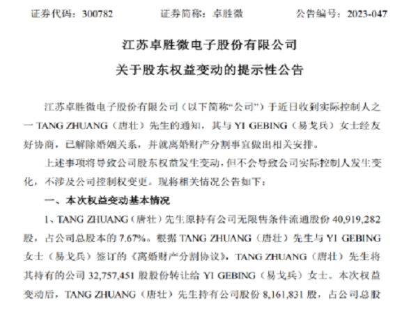 6月20日,卓胜微(300782)公告,实控人之一TANGZHUANG(唐壮)先生与YIGEBING(易戈兵)女士已解除婚姻关系,并就离婚财产分割事宜做出相关安排。
