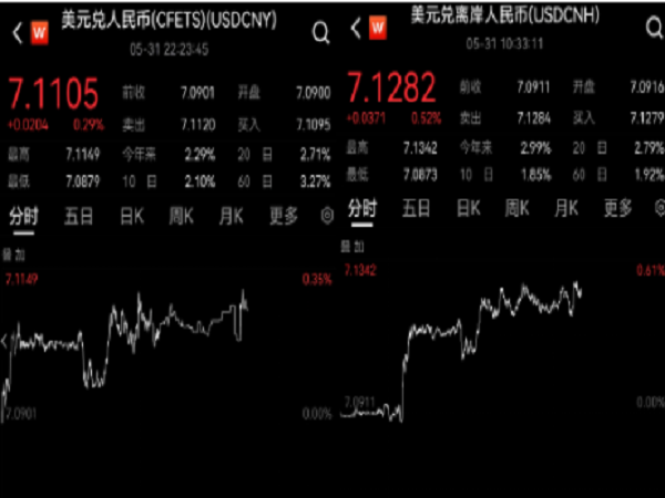5月31日,离岸人民币、在岸人民币纷纷跌破7.1关口,截至同日14:53,美元/人民币报7.0992,美元/离岸人民币报7.1137。美元指数维持在104.2附近,随着债务上限谈判出现积极进展、银行业危机化解、软着陆预期上升,美元指数较前期低点上涨近4%。