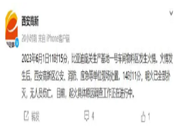 比亚迪“热销车型重要产地”西安工厂起火,回应称无人员伤亡