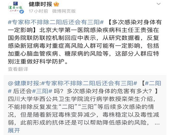 近日,健康时报发布的#专家称不排除二阳后还会有三阳#的消息引发众多网友关注。