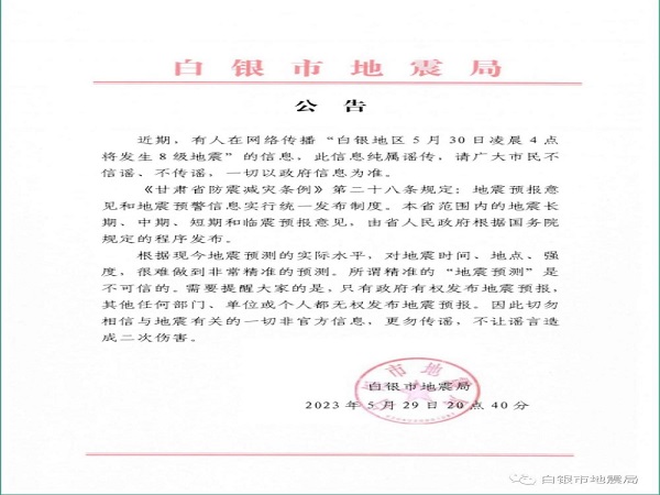 5月29日,白银市地震局官方微信发布公告表示,网传“白银地区5月30日凌晨4点将发生8级地震”相关信息纯属谣传。