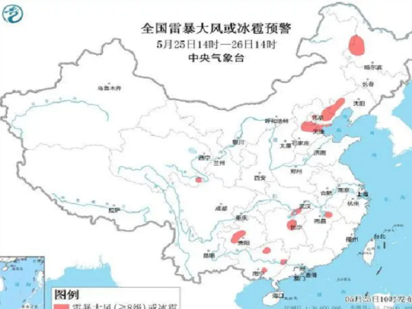 预计5月25日14时至26日14时,黑龙江西部、辽宁西部、河北中部和东北部、北京东北部和南部、天津、湖南中北部、江西北部、贵州中部、广西东部等地的部分地区将有8-10级雷暴大风或冰雹天气;