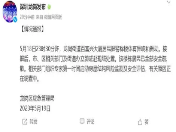 据@深圳龙岗发布 情况通报称,5月18日23时30分许,龙岗街道百富兴大厦居民报警称楼体有异响和振动。接报后,市、区相关部门及街道办立即赶赴现场处置。该楼栋居民已全部安全疏散。