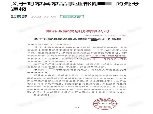 近日,上市家居公司索菲亚一则处分通报引发关注,通报称该司一高级工程师多次接受供应商吃喝宴请等,并利用职权要求供应商安排“三千一晚”的嫖娼活动,被解除劳动合同。