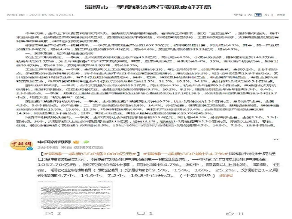 淄博一季度GDP超1000亿元,增长4.7%
