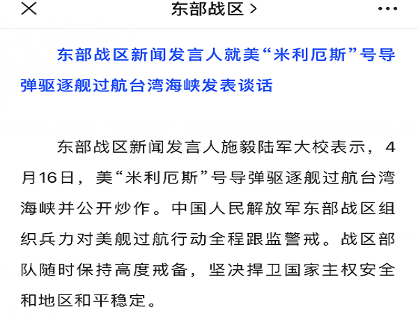 据东部战区公众号消息 东部战区新闻发言人就美“米利厄斯”号导弹驱逐舰过航台湾海峡发表谈话。