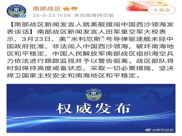 据中国人民解放军南部战区官方微博消息,南部战区新闻发言人田军里空军大校表示,3月23日,美“米利厄斯”号导弹驱逐舰未经中国政府批准,非法闯入中国西沙领海,破坏南海地区和平稳定,中国人民解放军南部战区组织海空兵力依法进行跟踪监视并予以警告驱离。
