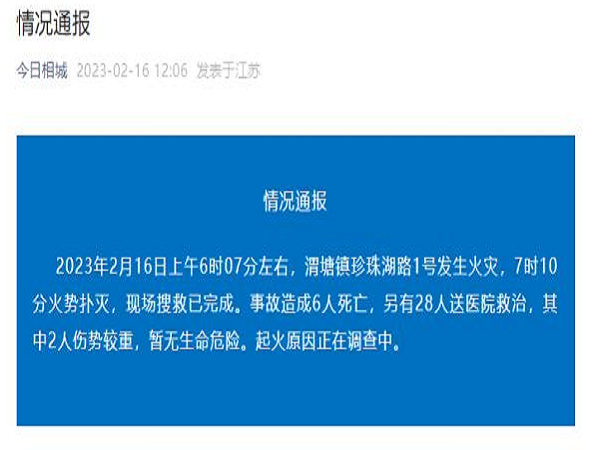 2023年2月16日上午6时07分左右,渭塘镇珍珠湖路1号发生火灾,7时10分火势扑灭,现场搜救已完成。事故造成6人死亡,另有28人送医院救治,其中2人伤势较重,暂无生命危险。起火原因正在调查中。