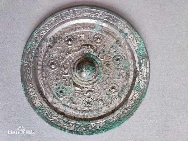 人民昌·中国强”汉镜为圆形,直径22.3厘米,厚0.7厘米,半球形钮,钮座饰一圈以短线间隔的几何纹,保存完好