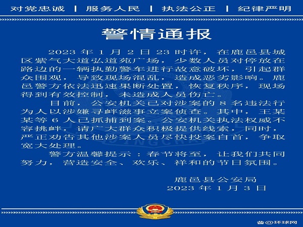 2023年1月2日23时许,在鹿邑县城区紫气大道弘道苑广场,少数人员对停放在路边的一辆执勤警车进行故意破坏,引起群众围观,导致现场混乱,造成恶劣影响。