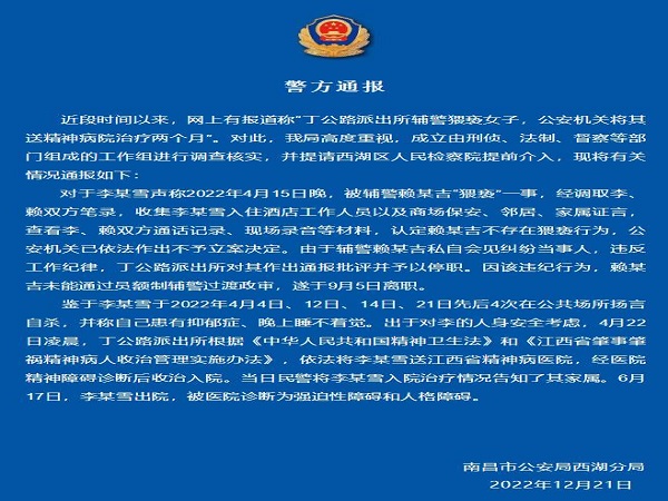 南昌警方通报女子称遭辅警猥亵:不存在猥亵行为