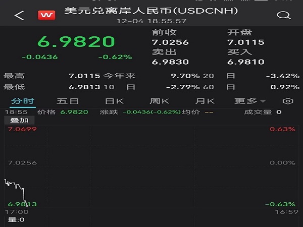 央广网北京12月5日消息 (记者 金龙)5日早盘,离岸人民币兑美元强势升破7.00关口,为9月份来首次,日内涨450点,最高报6.9665。