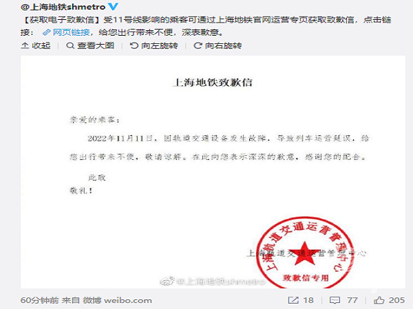 11月11日,@上海地铁shmetro发布《故障初步说明》:今早11号线触网故障,引发一列出库无人列车瞬间短路拉弧,现场伴有瞬时响声、烟雾和火光,并未引发火灾爆炸。目前,正在全力抢修中。
