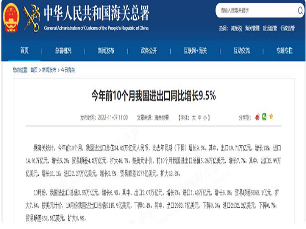 海关总署:今年前10个月我国进出口同比增长9.5%
