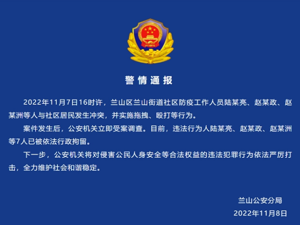 兰山公安分局11月8日在其微信公众号上通报,11月7日16时许,兰山区兰山街道社区防疫工作人员陆某亮、赵某政、赵某洲等人与社区居民发生冲突,并实施拖拽、殴打等行为。