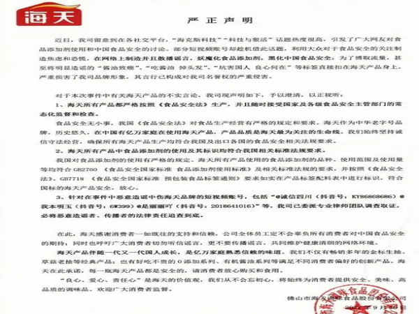 添加剂引舆论危机 海天酱油几度回应 争议仍未平息