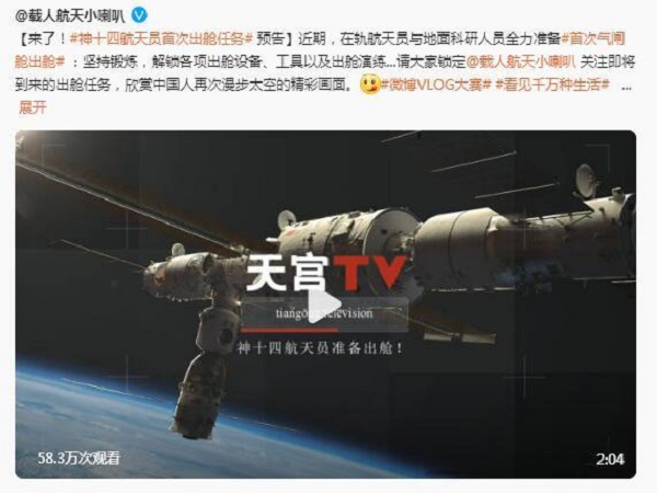 神十四乘组首次出舱官方预告:航天员已完成出舱全流程演练