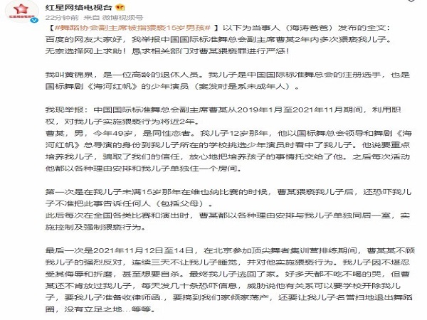 【舞蹈协会副主席被指猥亵15岁男孩】近日,湖南长沙。王先生(化姓)告诉媒体,自己出生于2004年的儿子,在2019年到2021年间多次被中国国际标准舞总会副主席猥亵。