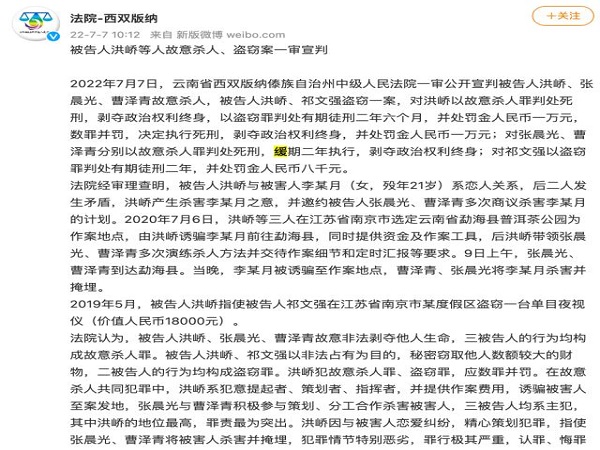 新京报讯 据西双版纳傣族自治州中级人民法院消息,2022年7月7日,云南省西双版纳傣族自治州中级人民法院一审公开宣判被告人洪峤、张晨光、曹泽青故意杀人,被告人洪峤、祁文强盗窃一案,对洪峤以故意杀人罪判处死刑,剥夺政治权利终身,以盗窃罪判处有期徒刑二年六个月,并处罚金人民币一万元,数罪并罚,决定执行死刑,剥夺政治权利终身,并处罚金人民币一万元;对张晨光、曹泽青分别以故意杀人罪判处死刑,缓期二年执行,剥夺政治权利终身;对祁文强以盗窃罪判处有期徒刑二年,并处罚金人民币八千元。