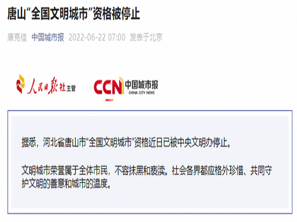 据悉,河北省唐山市“全国文明城市”资格近日已被中央文明办停止。
