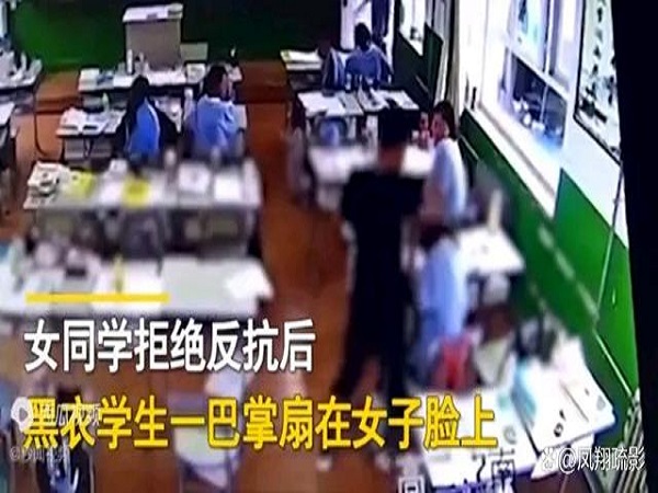 陕西榆林某中学高二教室里,同学们正在课间休息,这时一个穿黑衣服的男同学,上前“挑逗”女同学,遭到女同学的拒绝后,出人意料的情境出现,这个男同学竟在教室里暴打女同学!