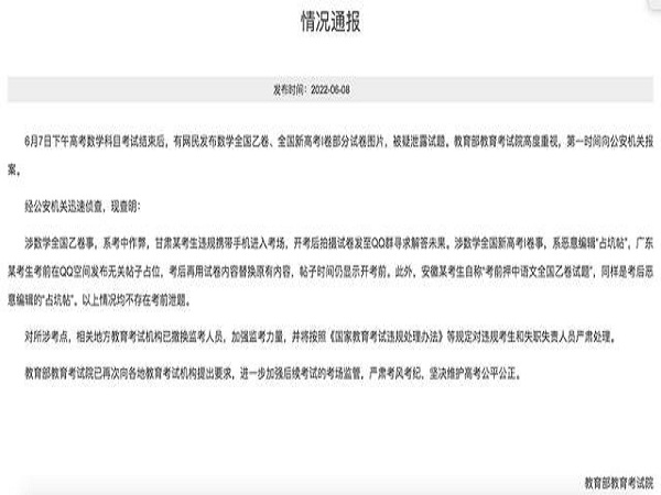 6月7日下午高考数学科目考试结束后,有网民发布数学全国乙卷、全国新高考I卷部分试卷图片,被疑泄露试题。教育部教育考试院高度重视,第一时间向公安机关报案。