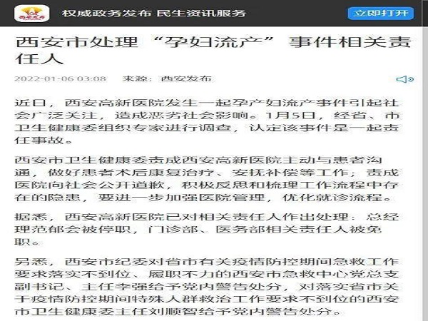 据“西安发布”客户端1月6日消息:近日西安高新医院发生一起孕产妇流产事件引起社会广泛关注,造成恶劣社会影响。1月5日,经陕西省、西安市卫生健康委组织专家进行调查,认定该事件是一起责任事故。