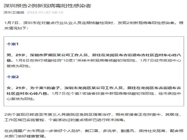 1月7日,深圳市在对重点行业从业人员定期核酸检测时,发现2例新冠病毒阳性感染者。