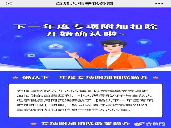 齐鲁网·闪电新闻12月6日讯 据央视报道,近日,个人所得税App开放了“确认下一年度专项附加扣除”功能,纳税人可通过该功能将2021年专项附加扣除信息一键带入2022年。
