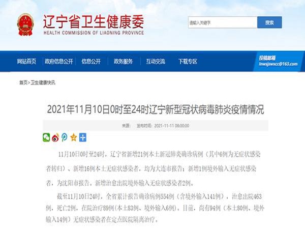 新京报快讯 据辽宁省卫健委网站消息,11月10日0时至24时,辽宁省新增21例本土新冠肺炎确诊病例(其中6例为无症状感染者转归)、新增16例本土无症状感染者,均为大连市报告;新增1例境外输入无症状感染者,为沈阳市报告。新增治愈出院境外输入无症状感染者2例。