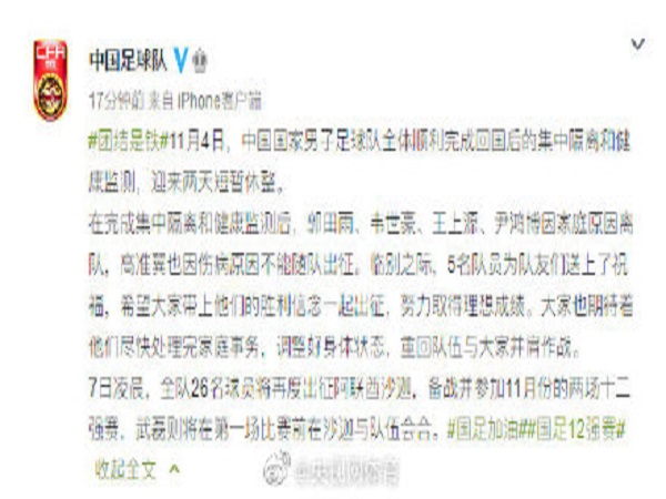 中国足球队消息,在4日完成集中隔离和健康监测后,郭田雨、韦世豪、王上源、尹鸿博因家庭原因离队,高准翼也因伤病原因不能随队出征。