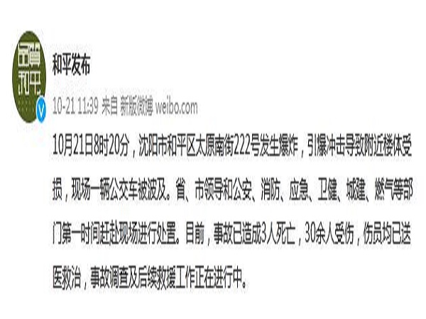 10月21日8时20分,沈阳市和平区太原南街222号发生爆炸,引爆冲击导致附近楼体受损,现场一辆公交车被波及。
