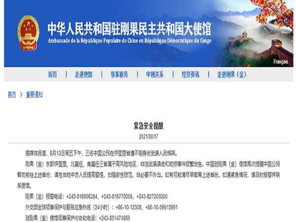 3名中国公民在刚果(金)遭绑架,中国大使敦促刚方全力搜救