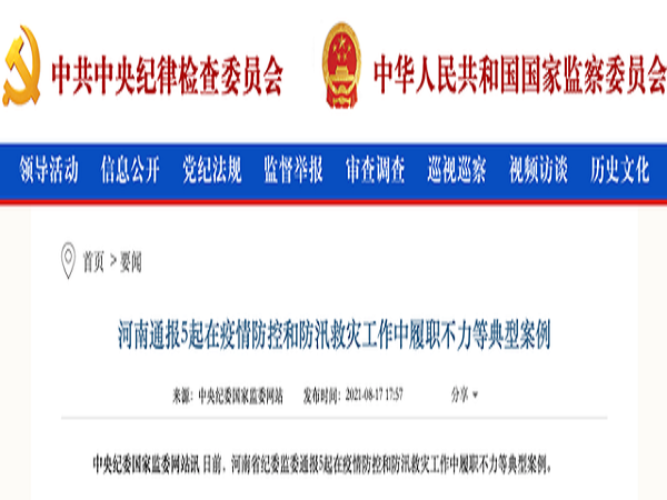 中央纪委国家监委网站 薛鹏 韩亚栋报道 8月16日,商丘市纪委监委发布通报,8名党员领导干部因在虞城县疫情防控中履职不力受到问责;8月14日,扬州市纪委监委通报12名党员干部因疫情防控不力受到问责处理;此前,张家界等地也有多名党员领导干部因在疫情防控中失职失责受到处理。