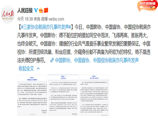 今日,中国电影家协会、中国音乐家协会、中国电视艺术家协会分别就吴亦凡事件发声。