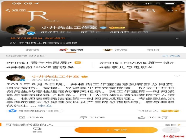 8月3日晚,井柏然工作室发布声明,称有部分网友大量传播一份关于井柏然的恶性造谣的聊天记录,在与井柏然商讨后,工作室决定报警,并分享了坐标为北京将台派出所的动态。红星新闻记者了解到,对于此事井柏然也在朋友圈发文:“来报案,清者自清!”
