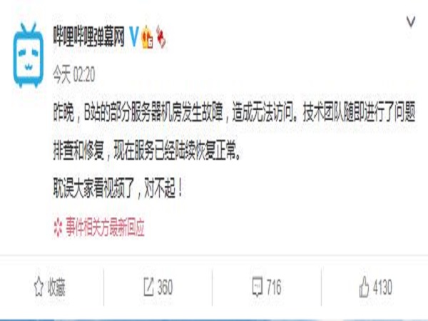 14日凌晨,B站发布消息称,昨晚,B站的部分服务器机房发生故障,造成无法访问。技术团队随即进行了问题排查和修复,现在服务已经陆续恢复正常。耽误大家看视频了,对不起!
