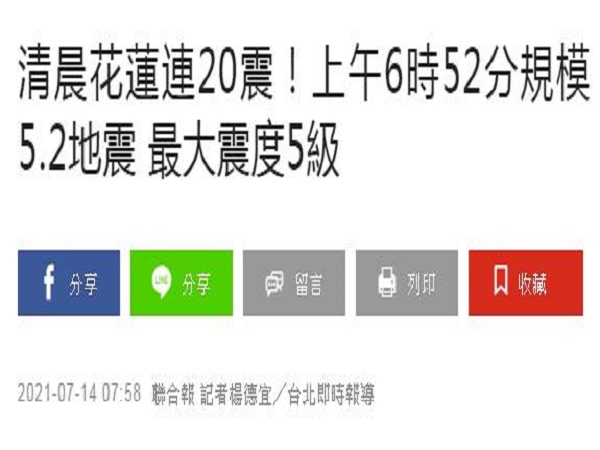 台媒:台湾花莲清晨接连地震20次,最高5.2级