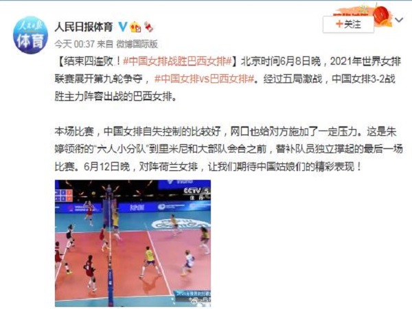 北京时间6月8日晚,2021年世界女排联赛展开第九轮争夺, 中国女排vs巴西女排。经过五局激战,中国女排3-2战胜主力阵容出战的巴西女排。