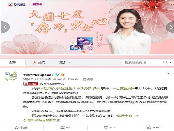 江西女子在卫生巾中发现针头?七度空间公开致歉
