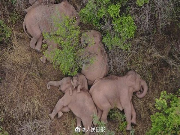 云南野象群今日暂停迁移,无人机拍下象群睡觉休息画面