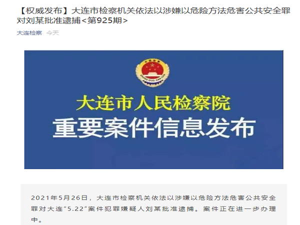据大连检察微信公众号消息,2021年5月26日,大连市检察机关依法以涉嫌以危险方法危害公共安全罪对大连“5.22”案件犯罪嫌疑人刘某批准逮捕。案件正在进一步办理中。